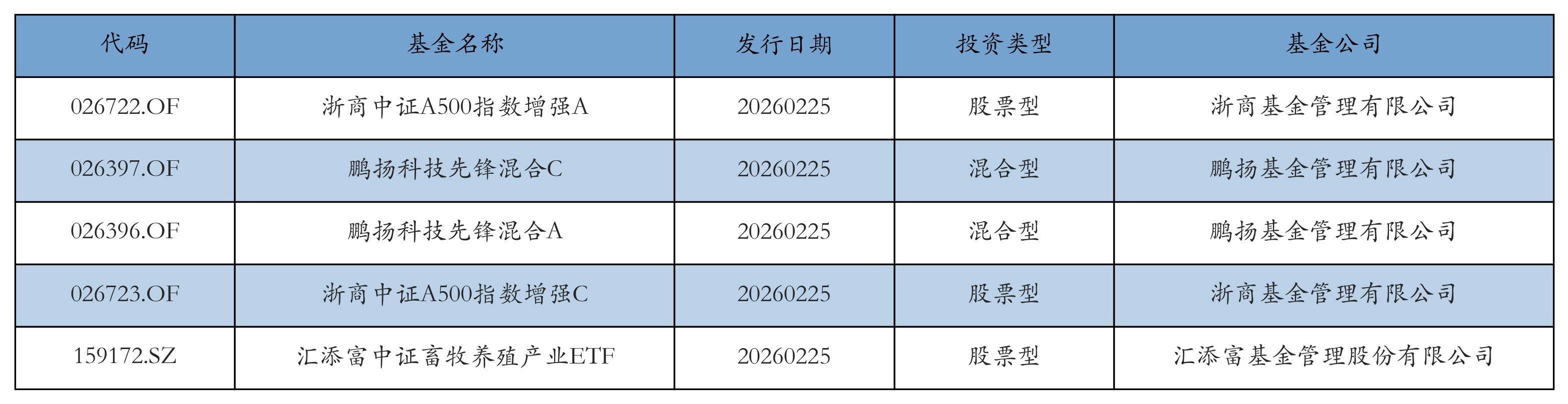 昨日有5只新基金刊行,分辨为:浙商中证A500指数增强A、鹏扬科技时尚混杂C、鹏扬科技时尚混杂A、浙商中证A500指数增强C、汇添富中证畜牧生息产业ETF,笃定见下表: