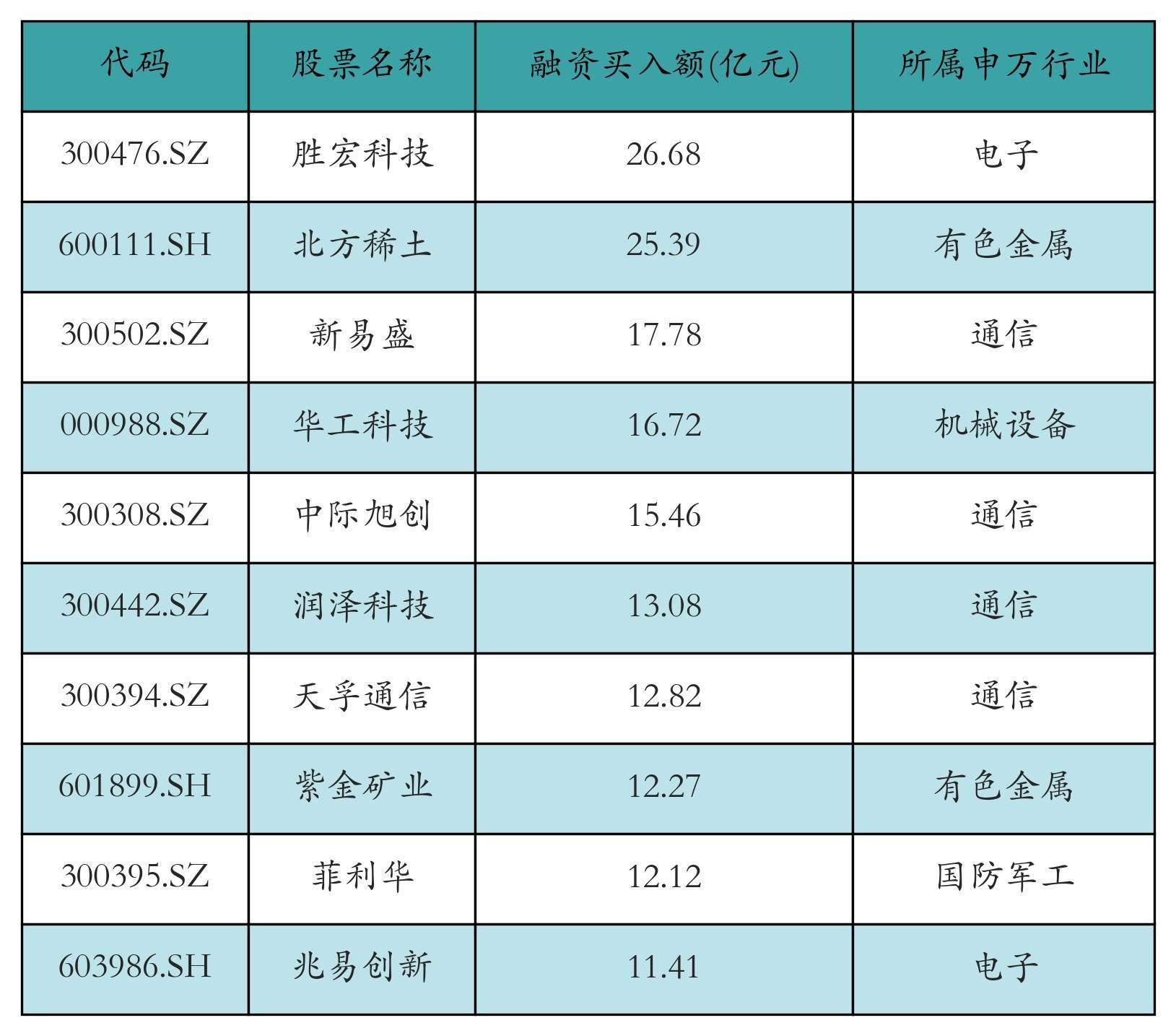 两市共有3484只个股有融资资金买入,其中胜宏科技、朔方稀土、新易着名次前三,买入金额分辨26.68亿元、25.39亿元、17.78亿元。融资买入额前10个股笃定见下表: